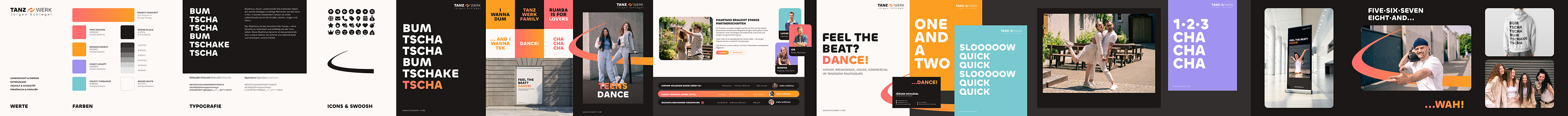 Das Branding der Tanzschule setzt auf die Vermittlung von Leidenschaft, Energie und einer warmen Atmosphäre. Es spiegelt die Dynamik und Vielfalt des Tanzens wider, wobei besonders die Farben Living Coral, Orange-Energy, Fancy-Violett und Trusty-Turquoise eine lebendige, kontrastreiche Bildsprache erzeugen. Der Swoosh als zentrales grafisches Element bringt Bewegung und Rhythmus ins Design, während das minimalistische Logo die Eleganz und Kraft der Marke unterstreicht.